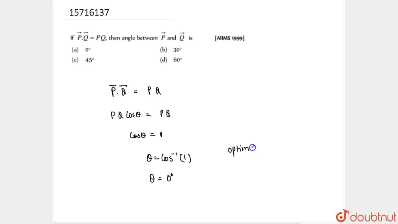 If p+q=p-q then angle between p and q is-WebAngle between (PQ) and (PQ) will be (A) O'only (B) 90° only 180°only (D) between 0 and 180° (both the values inclusive) Solution Verified by Toppr Solve any question of Work,WebBut this is simply possible if P → = 0 or Q → = 0 or the angle between P → and Q → = 180 ° (0 ° < θ < 360 °) So, θ = 180 ° Hence, the value of θ will be 180 °